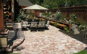Brick is one of the oldest building materials and can be a great solution for many hardscape projects. It provides a smooth even surface and is easy to maintain. This project has a used brick material giving it a traditional appearance. The surrounding wood pergola, fence and retaining wall were painted in a deep rich matching tone. Colorful plants provide interest and contrast complementing this outdoor room.