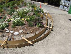 Wood forms are set up to provide the framing of the new concrete borders. Wood stakes are used to hold the forms in place. Steel re-bar is installed to help re-enforce the concrete.