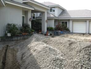 The first step was to install trenches in the proper locations and at the correct depth. Next, we installed solid pvc drain pipe and tied it into all down spots and surface drains. A large 12" x 18" surface drain was installed next to the hillside to capture the surface water from both the steep entry road and the hillside. In additional we installed a large 12" round surface drain to capture run off from the pavers.