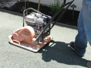 The base rock is evenly graded and compacted with a plate compactor. The gravel is watered during this stage to help settle the fines and increase the compaction.