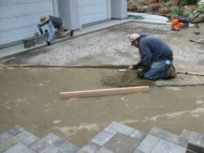 After the concrete borders are installed, forms removed and the base rock compacted an approximate 1" layer of course sand is installed. The sand is leveled to the correct height and we are ready for paver installation.