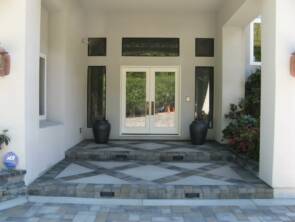 This gorgeous front driveway and entryway have a blend of colors from Calstone that complement this home's formal architecture. The entryway was a design combination of concrete and matching inlayed pavers providing an elegant and stylish impact. Drainage was a major consideration involving surface, channel and sub-surface drainage.