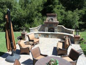 This back yard makes a real statement showcasing the Calstone paver. The Calico Ridge color is a charming accent to the home and patio furniture. The custom fireplace flagstone and brick veneer complement this stylish paver.