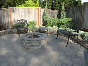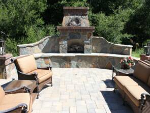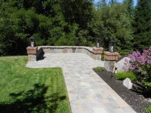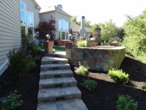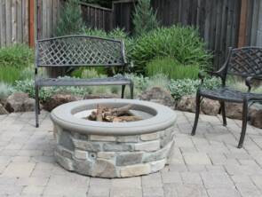 Rear charming Basalite paver patio with combination natural and manufactured stone wall border makes a great gathering area for family and friends. The Venice colored paver ties into the firepit veneer and cap creating a peaceful atmosphere.