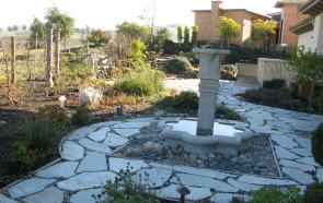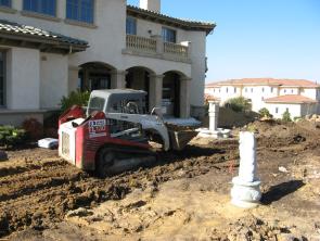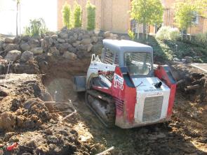 On top is the before picture of our renovation project. This project had an existing flagstone patio and large planting beds. We started by removing the existing hardscape and softscape. Then we excavate the soil to the proper elevations. The soil is loaded onto dump trucks or dump trailers and hauled away.