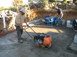 Base rock is installed at the proper depth and compacted using a plate compactor. The rock is sprayed with water to increase our compaction and help settle the aggregates and soils. Next we install our steel rebar 18" on center. Dobies are installed to lift the steel into the center of the concrete.