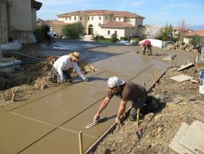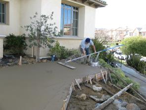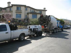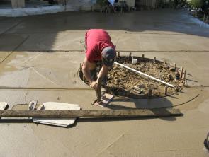 In many cases the concrete must be pumped from the concrete truck to the placement location. A large diesel concrete pump is used to transport the concrete thru a hose to the patio, pool deck, footing, walkway or driveway. Now its time to level and finish the concrete.