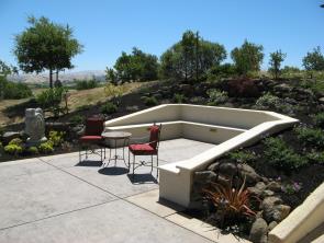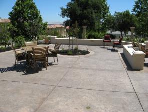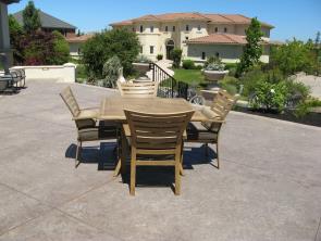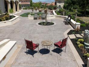 Rear Patio with seamless stamped concrete, 90 degree score lines and a 12" smooth band. The dark walnut release color serves as a pleasing accent with the tan / brown tones of the exterior stucco of the home and seat walls.